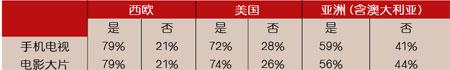 在被問及每月愿意花多少錢來收看手機電視和電影大片時,歐洲和美國的被調查者表示出非常低的支付意愿。在歐洲,79%的被調查者不愿意為手機電視和電影支付費用,美國的情況更糟糕,澳大利亞的回答則與歐洲的回答非常接近。在亞洲,59%的被調查者不愿為這些服務支付費用。在日本,72%的被調查者不愿為手機電視付費,但是對于支付手機電影大片的反對率下降到了55%。(見表2)