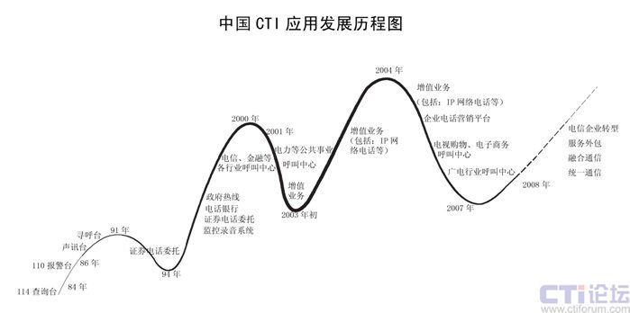 CTI在中國(guó)已經(jīng)發(fā)展了二十多年,已經(jīng)從最早的電信行業(yè)CTI應(yīng)用發(fā)展到金融(包括銀行、保險(xiǎn)、證劵及基金)、電力、郵政、企業(yè)(包括煙草、汽車(chē)、家電、IT、互聯(lián)網(wǎng)、旅游、報(bào)業(yè)、航空、物流、醫(yī)療、公共事業(yè)等)、政府、軍隊(duì)等各行各業(yè)的應(yīng)用。特別在1995年到2001時(shí)期,是CTI應(yīng)用發(fā)展最快,普及面最廣的時(shí)期,也是CTI市場(chǎng)進(jìn)入了第二次高潮;從2002開(kāi)始增值業(yè)務(wù)是整個(gè)CTI行業(yè)的突破口,整個(gè)行業(yè)以增值業(yè)務(wù)為主,CTI市場(chǎng)進(jìn)入了第三次高潮;從2006年開(kāi)始,增值業(yè)務(wù)進(jìn)入了衰退期,整個(gè)CTI行業(yè)市場(chǎng)出現(xiàn)了嚴(yán)重的危機(jī),加上新的技術(shù)出現(xiàn),技術(shù)的換代,對(duì)原來(lái)的傳統(tǒng)語(yǔ)音產(chǎn)品和公司是個(gè)致命的打擊。