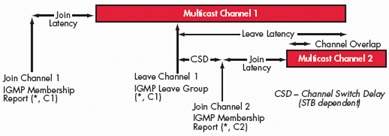 TV節(jié)目通常采用組播方式進行傳送。組播是一種允許一個或多個發(fā)送者(組播源)一次同時發(fā)送單一的數據包到多個接收者的網絡技術。組播源把數據包發(fā)送到特定組播組,而只有屬于該組播組的地址才能接收到數據包。在IPTV里,組播源往往僅有一個,即使用戶數量成倍增長,主干帶寬也不需隨之增加,因為無論有多少個目標地址,在整個網絡的任何一條主干鏈路上只傳送單一視頻流,即所謂“一次發(fā)送,組內廣播”。組播提高了數據傳送效率,減少了主干網出現(xiàn)擁塞的可能性。對于TV系統(tǒng)而言,其所能夠支持的用戶數目僅僅受到接入網絡能力的限制,與前端推送系統(tǒng)的推送能力無關。因此,TV業(yè)務性能的主要測試指標包括所推送的最大頻道數目、頻道平均帶寬、平均頻道切換時間、I幀加入延時、平均頻道離開延時、平均頻道加入延時、頻道重疊時間和頻道間隔時間。