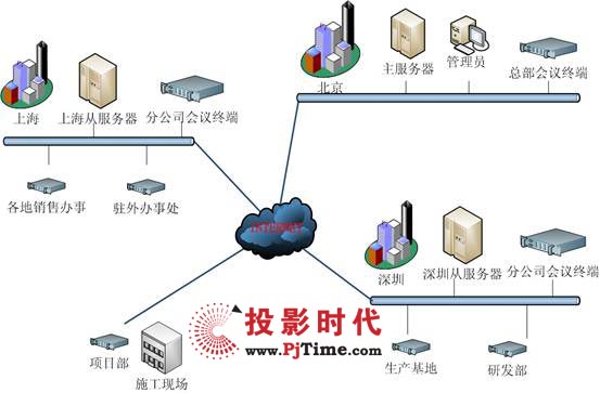 3臺高端專用服務器作為視頻會議服務器,可容納多點同時開會,以確保系統(tǒng)的穩(wěn)定性和性能要求。主服務器放置在總公司,從服務器共2個,分別放置在輻射分公司面大,位于分公司中心的兩個城市。所有接入的服務器和客戶端采用同一網絡服務商的線路。配置了使用1000M服務器專用網卡,以保證正常的音視頻信號的傳輸。并且將服務器放置在主干/核心交換機上,使服務器和客戶端的路由/交換性能達到最佳效果。其網絡拓撲圖如下: