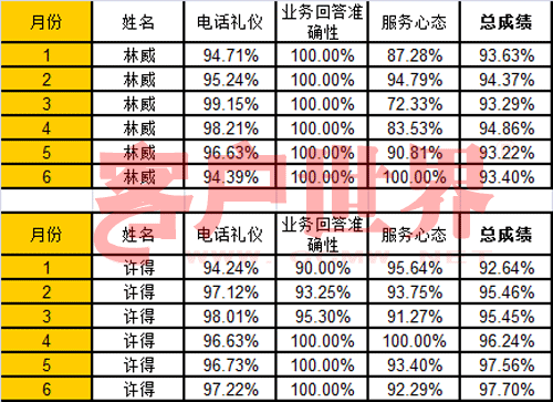 上面這兩張表格,是兩位員工的質檢分數,從今年一月份開始,一月到六月每個月的質檢分數,你看到有總分,還有三個分項的成績。請問,林威是新員工,還是許得是新員工?我們下一期公布答案。