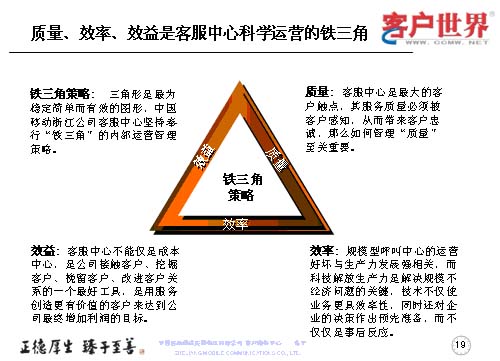 應(yīng)該說(shuō)這三個(gè)方面是科學(xué)運(yùn)營(yíng)的一個(gè)鐵三角,這是我們的理解,因?yàn)槿切,始終認(rèn)為是最穩(wěn)定、簡(jiǎn)單、有效的圖形,也是我們?cè)谶M(jìn)行內(nèi)部運(yùn)營(yíng)的管理鐵架。質(zhì)量是客服中心最大的觸點(diǎn)當(dāng)中被客戶感知,從而帶來(lái)客戶忠誠(chéng)的,如何管理質(zhì)量,那就至關(guān)重要。效率尤其是規(guī)模型的呼叫中心的運(yùn)營(yíng)好壞,是與生產(chǎn)力的發(fā)展強(qiáng)相關(guān),而科技解放生產(chǎn)力是解決規(guī)模問(wèn)題的關(guān)鍵。技術(shù)不僅是運(yùn)行更具效益率,同時(shí)還對(duì)企業(yè)的決策作出預(yù)先準(zhǔn)備,而不僅僅是事后反應(yīng)。很多年來(lái),更多的企業(yè)是把客服中心視為成本中心,而事實(shí)上,效益的顯現(xiàn)讓我們陸續(xù)地走出了成本中心,它應(yīng)該是公司接觸客戶、挖掘客戶、挽留客戶、改進(jìn)客戶關(guān)系的一個(gè)最好工具,是用服務(wù)創(chuàng)造更有價(jià)值的客戶,來(lái)達(dá)到公司最終增加利潤(rùn)的目標(biāo)。