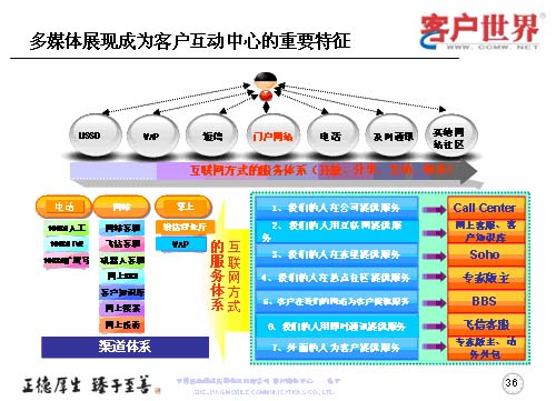 世界上卓越的企業(yè)無(wú)所不在,在客戶戰(zhàn)略上最具創(chuàng)新能力的企業(yè),奠定起的競(jìng)爭(zhēng),也會(huì)越來(lái)越出體現(xiàn)在客戶關(guān)系管理上,隨著數(shù)據(jù)業(yè)務(wù)成為運(yùn)營(yíng)商的主流業(yè)務(wù),呼叫中心在服務(wù)、營(yíng)銷、渠道管理等方面的戰(zhàn)略地位會(huì)日益重要,隨著客戶接觸的不斷增長(zhǎng),呼叫中心將逐漸演變成客戶接觸中心、互動(dòng)中心,乃至包括實(shí)體渠道之外的各種電子渠道,任重而道遠(yuǎn)。