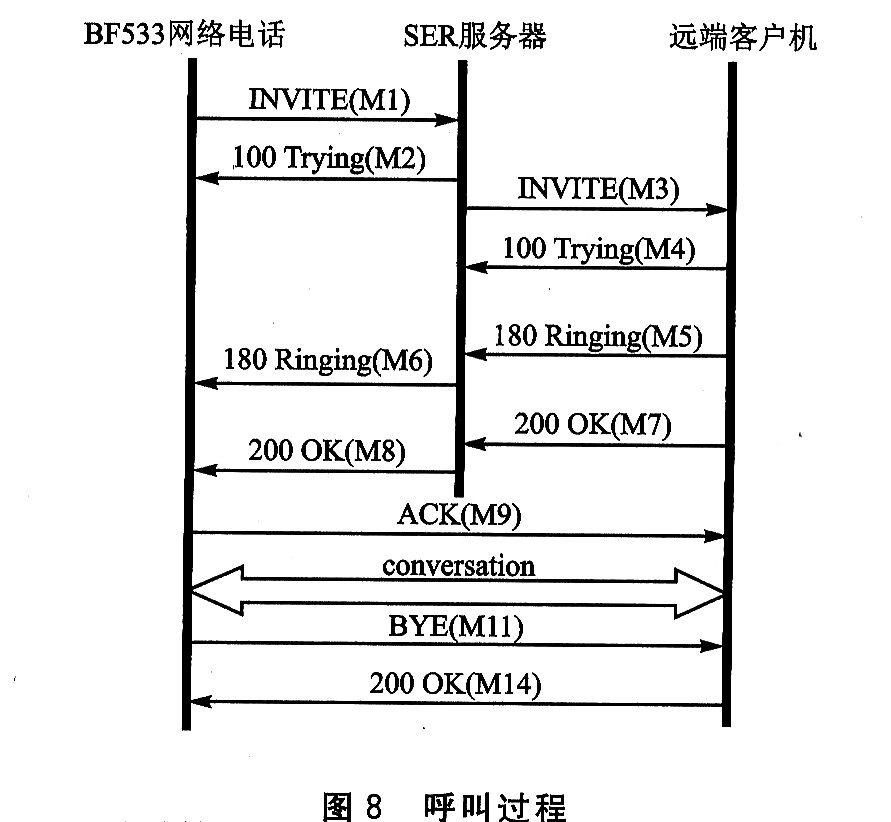 呼叫過程如圖8所示。BF533網(wǎng)絡電話(BP)先是向SER服務器發(fā)送了一條INⅥTE消息(M1),要求與遠端客戶機(RC)進行對話。SER馬上回復一條100
