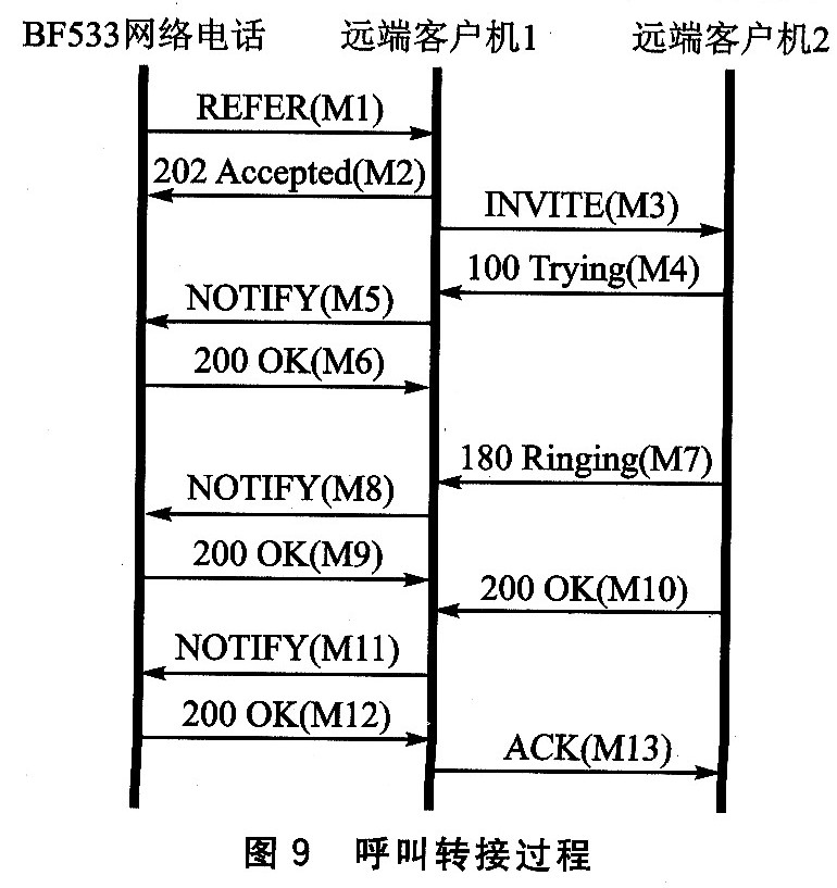 該過程是通過擴展的SIP信令REFER來完成的,交互過程如圖9所示。當BF533網(wǎng)絡電話要將它和遠端客戶機1(RCl)的通話轉(zhuǎn)接到遠端客戶機2(RC2)時,BF發(fā)送REFER(M1)給RCl,該信息中Refer—To字頭標明了RC2的URL,之后RCl回復202