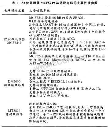 MCF5249模塊單元主要由32位處理器MCF5249和若于外圍器件AM29LV160DB90快閃存儲器、K4S281632SDRAM、SP3223串行通訊電路、DM9000網(wǎng)絡接口芯片、MT8816音視頻矩陣電路等硬件構(gòu)成。其主要性能如下表1所示。