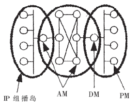 混合式組播的核心任務(wù)是為AM完成拓?fù)?包括數(shù)據(jù)拓?fù)浜涂刂仆負(fù)?的構(gòu)建。由于網(wǎng)絡(luò)狀況的動(dòng)態(tài)性,以及客戶端數(shù)量與客戶端加入系統(tǒng)時(shí)間的不確定性,當(dāng)前的應(yīng)用層組播方案一般需要每個(gè)結(jié)點(diǎn)定期與其他全部或一定比例的結(jié)點(diǎn)交換控制信息,以了解其他結(jié)點(diǎn)的狀態(tài),形成控制拓?fù)?保障數(shù)據(jù)拓?fù)涞慕研。在結(jié)點(diǎn)個(gè)數(shù)逐漸增加時(shí),網(wǎng)絡(luò)上的控制信息數(shù)量會(huì)占用大量的帶寬資源。應(yīng)用層組播的數(shù)據(jù)拓?fù)淇煞譃槎箢?信源樹(shù)和共享樹(shù)。信源樹(shù)必須為每個(gè)組播源保存路由信息,這樣會(huì)占用大量的系統(tǒng)資源。共享樹(shù)傳輸延時(shí)較大。IP視頻會(huì)議系統(tǒng)屬于實(shí)時(shí)交互應(yīng)用,視音頻數(shù)據(jù)占據(jù)很大的帶寬,并且對(duì)端到端傳輸延遲和網(wǎng)絡(luò)抖動(dòng)的要求很高,需要尋找一種既可以減少交換控制信息又可以保證視音頻數(shù)據(jù)實(shí)時(shí)傳輸?shù)耐負(fù)錁?gòu)建方式。為利用排列圖的優(yōu)越特性(如結(jié)點(diǎn)和邊的對(duì)稱性、故障恢復(fù)能力和容錯(cuò)能力、可以嵌入獨(dú)立的組播樹(shù)等),這里采用分層排列圖的結(jié)構(gòu)來(lái)組織混合式組播中的AM。
