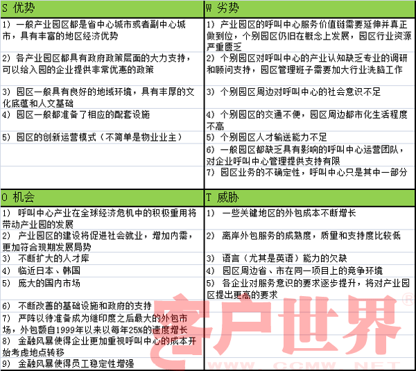 筆者在此更愿意用SWOT分析的模式來闡述中國(guó)呼叫中心產(chǎn)業(yè)園區(qū)的特點(diǎn):