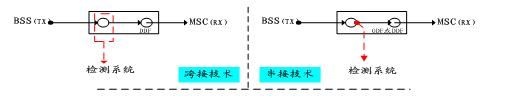 目前在GSM網(wǎng)信令檢測(cè)領(lǐng)域,主要應(yīng)用的措施有跨接技術(shù)、串接技術(shù)兩種。其圖示如下: