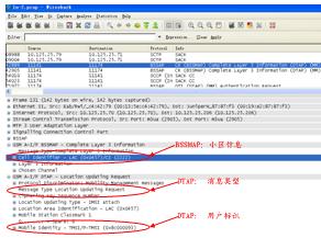 以上是一個(gè)用戶開機(jī)的信令過程,在BSSMAP消息層中,可以獲取CGI=0X0457-2222;在DTAP消息層中,可以獲得獲得本次消息類型為L(zhǎng)ocationUpdatingREQ,同時(shí)用戶標(biāo)識(shí)為TMSI=0X8c000093,通過對(duì)對(duì)之前或之后(簽權(quán)、IDREQ/RSP)等信令的關(guān)聯(lián),可以獲得用戶IMSI、MSISDN和CGI的對(duì)應(yīng)關(guān)系。其它信令過程,如周期性位置更新、短信收發(fā)、主被叫等,和以上分析過程類似。
