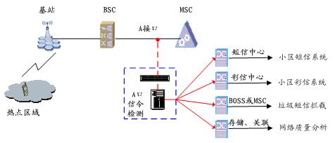 A口信令檢測(cè)的應(yīng)用非常廣泛,如網(wǎng)絡(luò)質(zhì)量分析系統(tǒng)、小區(qū)短信、小區(qū)彩信、垃圾短信攔截等。這些正成為通信運(yùn)營商的業(yè)務(wù)增長(zhǎng)點(diǎn)。其業(yè)務(wù)應(yīng)用組網(wǎng)圖如下: