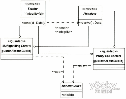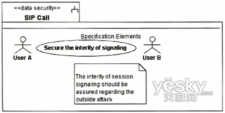 圖3中的UA代表UserA或UserB的UA,因?yàn)閮蓚UA的信令交互需要通過Proxy,且其安全需求是一致的,故在圖中只表現(xiàn)出一方。UA和Proxy均是基于通用計(jì)算平臺的節(jié)點(diǎn),其訪問控制需要受到保護(hù),故對其標(biāo)記上定型《guardedaccess》。UA中除處理信令外,還需處理媒體流的編解碼與控制,這個用例中只涉及信令的安全性,故在UA中只關(guān)注進(jìn)行信令控制的組件。UA與Proxy之間的通信基于IP承載,根據(jù)表1定義的威脅函數(shù):ThreatA(IP