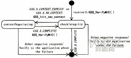 圖6中,在send()方法被調(diào)用后,Sender首先檢測是否已有可用的安全上下文,如果可用的安全上下文已經(jīng)存在,則可以利用該上下文的句柄作為參數(shù)之一,調(diào)用GSS-API的Get_GetMIC()方法。參數(shù)還包括有待進(jìn)行簽名的消息和可選的QoP。如果對消息簽名可以正常完成,Sender就可以將消息與簽名后生成的token一起送到目的地。如果簽名發(fā)生異常,則可以通過返回的錯誤碼判斷原因。