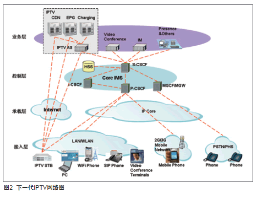 基于網(wǎng)絡(luò)視訊框架的下一代IPTV架構(gòu)堅(jiān)持業(yè)務(wù)與網(wǎng)絡(luò)、信令與媒體相分離的設(shè)計(jì)思想,以IMS為交換核心網(wǎng),以APP應(yīng)用服務(wù)器為業(yè)務(wù)引擎,以CDN為媒體分發(fā)網(wǎng)絡(luò),兼容移動(dòng)網(wǎng)絡(luò)、寬帶網(wǎng)絡(luò)和IMS/NGN網(wǎng)絡(luò),支持IPTV機(jī)頂盒、PC、智能終端,乃至3G終端(包含CS、PS域)等多樣化的類型終端,從而提供網(wǎng)絡(luò)電視、視頻點(diǎn)播、信息服務(wù)、PVR、TSTV、游戲、視頻通信等內(nèi)容豐富且無(wú)所不在的IPTV業(yè)務(wù)。