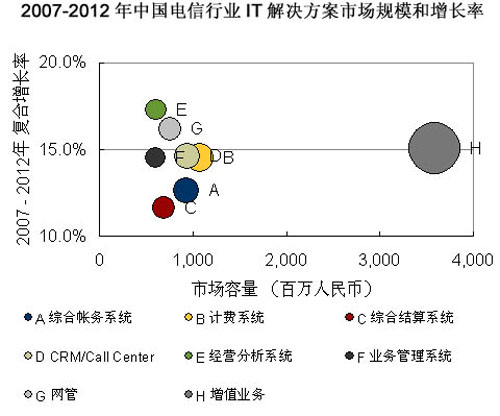巨大的電信市場蛋糕給產業(yè)鏈的各級廠商都帶來良好的發(fā)展機遇,而其運營支撐系統(tǒng)市場無疑將是增長最快的一部分。據(jù)市場調查機構IDC預計,2007年-2012年電信行業(yè)將注重運營支撐系統(tǒng)的全業(yè)務運營整合和支持前端業(yè)務,因此3G增值業(yè)務、經營分析系統(tǒng)、客戶關系管理系統(tǒng)、IT服務管理系統(tǒng)等建設將實現(xiàn)快速增長。運營商的已有項目仍然會持續(xù)升級維護,以及配合全業(yè)務運營作出功能上的提升。IDC預計,2012年電信行業(yè)IT解決方案整體市場規(guī)模將達到193.5億元人民幣。