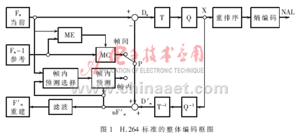 Abstraction Layer),負(fù)責(zé)對數(shù)據(jù)進(jìn)行打包和傳送。H.264編碼圖像通常分為三種類型:I幀、P幀、B幀。I幀為幀內(nèi)編碼幀,其編碼不依賴于已編碼的圖像數(shù)據(jù)。P幀為前向預(yù)測幀,B幀為雙向預(yù)測幀,編碼時都需要根據(jù)參考幀進(jìn)行運(yùn)動估計。同時,H.264在提高圖像傳輸容錯性方面做了大量工作,重新定義了適于圖像的結(jié)構(gòu)劃分。在編碼時,圖像幀各部分被劃分到多個Slice結(jié)構(gòu)中,每個Slice都可以被獨(dú)立編碼,不受其他部分影響。Slice由圖像最基本的結(jié)構(gòu)——宏塊組成,每個宏塊包含一個16×16的亮度塊和兩個8×8的色度塊。H.264標(biāo)準(zhǔn)的整體編碼框圖如圖1所示。編碼過程中,原始數(shù)據(jù)進(jìn)入編碼器后,當(dāng)采用幀內(nèi)編碼時,首先選擇相應(yīng)的幀內(nèi)預(yù)測模式進(jìn)行幀內(nèi)預(yù)測,隨后對實(shí)際值和預(yù)測值之間的差值進(jìn)行變換、量化和嫡編碼,同時編碼后的碼流經(jīng)過反量化和反變換之后重構(gòu)預(yù)測殘差圖像,再與預(yù)測值相加得出重構(gòu)幀,得出的結(jié)果經(jīng)過去塊濾波器平滑后送入幀存儲器。采用幀間編碼時,輸入的圖像塊首先在參考幀中進(jìn)行運(yùn)動估計,得到運(yùn)動矢量。運(yùn)動估計后的殘差圖像經(jīng)整數(shù)變換、量化和嫡編碼后與運(yùn)動矢量一起送入信道傳輸。同時另一路碼流以相同的方式重構(gòu)后,經(jīng)去塊濾波后送入幀存儲器作為下一幀編碼的參考圖像。