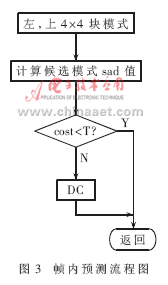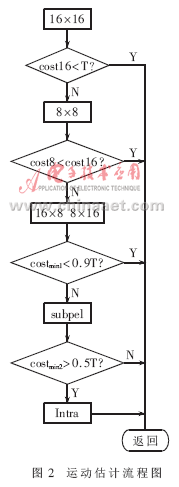 (4)算法替代和改進(jìn)。幀間預(yù)測的改進(jìn):關(guān)于算法的改進(jìn)主要集中在對me(motion estimation)的改進(jìn)上,流程如圖2所示。costmin1=min(cost16,cost8,cost16×8,cost8×16),costmin2=min(costmin1,costsub),依次在16×16、8×8、16×8和8×16大小宏塊的整像素位置做預(yù)測,再做次像素估計和幀內(nèi)預(yù)測,選用匹配準(zhǔn)則函數(shù)(采用sad作為匹配準(zhǔn)則函數(shù))取得最小值的模式進(jìn)行編碼。每計算一種模式,都將sad值與一個經(jīng)驗(yàn)閥值做比較。當(dāng)sad值小于這個閥值時,立即結(jié)束運(yùn)動估計,從而減少運(yùn)算量。