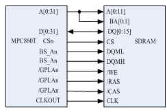 SDRAM的CLK信號由MPC860T的輸出時鐘CLKOUT驅(qū)動,/WE、/RAS和/CAS信號分別由UPMA的GPLA1~GPLA3產(chǎn)生。SDRAM的A10引腳要復(fù)用于SDRAM的刷新控制,因而必須與GPLAO相連(由于不方便連線圖中未畫出),因為MPC860T的GPLAO可以通過編程實現(xiàn)控制信號與地址信號的復(fù)用。MT48LC4M16A2內(nèi)部有12條行地址和8條列地址,行地址為高位地址,列地址為低位地址,而外部僅有12條地址信號A0~A11。這就需要對UPM對地址進行復(fù)用。MPC860T支持內(nèi)部地址復(fù)用,可以通過UPM的RAM字中的AMX位進行配置,同時將OR寄存器中的SAM位同時進行配置。相關(guān)寄存器配置為:BR2=Ox0000081,說明:32位寬,無奇偶校驗,無寫保護,選擇UPMA,基地址00000000;OR2=OxFF000A00,說明:16Mbyte容量,地址復(fù)用。