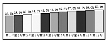 除了分檔包月的語音套餐,KDDI還根據(jù)消費者的不同需求提供了多樣折扣優(yōu)惠,其中包括在網(wǎng)時長優(yōu)惠、家庭優(yōu)惠、個人優(yōu)惠、學生優(yōu)惠等多種方式(圖1)。多樣優(yōu)惠折扣方式之間也可以通過組合產生新的優(yōu)惠折扣內容。例如:在網(wǎng)時長優(yōu)惠與家庭優(yōu)惠共享的套餐在入網(wǎng)的第1年優(yōu)惠折扣達到40%,此后每續(xù)約1年將增加1%的折扣優(yōu)惠,逐年累積下來,在第11年將享受高達50%的優(yōu)惠折扣(圖2)。時段優(yōu)惠套餐中體現(xiàn)分時段優(yōu)惠,區(qū)分忙時、閑時,周末時間和工作時間,分別定價。例如,同樣是9500日元的套餐檔次,在時段優(yōu)惠套餐中,周末白天(閑時)的資費是每分鐘10日元,而在非時段優(yōu)惠的普通套餐中,每分鐘的資費是24日元,可見在網(wǎng)絡閑時可以享受更多的資費優(yōu)惠。而針對學生和老人設計的套餐也能享受比普通套餐更優(yōu)惠的資費,這就體現(xiàn)了區(qū)別細分市場的差異化定價。