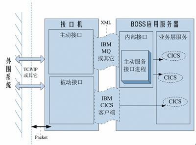 由圖1可知,從調(diào)用方向的角度看,接口可分為主動接口和被動接口,分別表示BOSS調(diào)用外圍系統(tǒng)服務(wù),以及外圍系統(tǒng)調(diào)用BOSS服務(wù)。主動接口由BOSS應(yīng)用服務(wù)器驅(qū)動,即BOSS應(yīng)用服務(wù)器上的主動服務(wù)接口進(jìn)程,是調(diào)用CICS對相關(guān)待處理表進(jìn)行輪詢,并將每一條記錄封裝為一條消息放入MQ隊列(該隊列均由消息組成),接口機(jī)上的主動接口再從隊列中取出消息進(jìn)行解析,進(jìn)而根據(jù)控制信息發(fā)送到指定系統(tǒng)執(zhí)行。被動接口則是由外圍系統(tǒng)驅(qū)動,通過接口機(jī)上的CICS客戶端調(diào)用BOSS應(yīng)用服務(wù)器上的業(yè)務(wù)層服務(wù)操作數(shù)據(jù)庫。