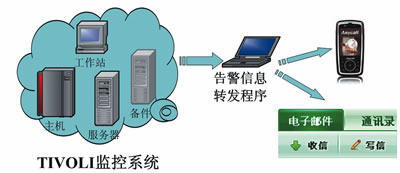 在具體實(shí)施上,為了形成統(tǒng)一的體系以方便監(jiān)控并達(dá)到告警信息與實(shí)時的反饋,可將以上4個層面因素納入IBM公司開發(fā)的TIVOLI監(jiān)控系統(tǒng)。除此之外,為實(shí)現(xiàn)告警信息的自動推送與分發(fā),可將自行開發(fā)告警信息轉(zhuǎn)發(fā)程序接入TIVOLI監(jiān)控系統(tǒng)信息庫。一旦檢測到異常信息存在則立即進(jìn)行短信或郵件的發(fā)送,確保維護(hù)人員及時了解接口系統(tǒng)運(yùn)行情況。整個過程如圖2所示。