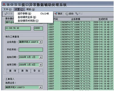 利用BOSS接口異常數(shù)據(jù)輔助處理系統(tǒng)執(zhí)行以上應(yīng)急流程的方式是:在提取號碼后,根據(jù)客服協(xié)議開機(jī)命令字10007格式要求(HandsetNo~工號~返回格式~nCode~sType~備注),將批量號碼構(gòu)造成報文列表并導(dǎo)入系統(tǒng)執(zhí)行。主界面如圖5所示。
