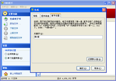 對(duì)于單個(gè)批量轉(zhuǎn)換的用戶(hù)而言,UMD舵手擁有智能斷章功能,完美解決了TXT電子書(shū)在手機(jī)上無(wú)法分章的難題。在“章節(jié)設(shè)置”選項(xiàng)卡中輸入用于制作章節(jié)目錄的關(guān)鍵字。例如:1、“第一章華山論劍”,則輸入的關(guān)鍵字可為:“第*章”;“一、華山論劍”,則輸入的關(guān)鍵字可為:“N、”;“【華山論劍】”,則輸入的關(guān)鍵字可為:“【*】”;“1-3-5節(jié):華山論劍”,則輸入關(guān)鍵字可為:“N-N-N