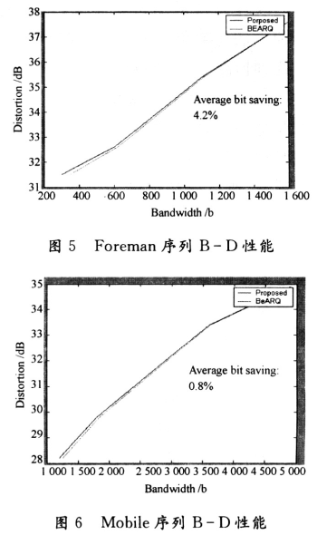 將圖4~圖6對比可以看出,對于運動程度很低且紋理相對平緩的Akiyo序列來說,相對盡力而為ARQ機制,本文的機制在3%的丟包情形下可以節(jié)省20%以上的帶寬。而對運動較為劇烈的Foreman序列來說,則只能節(jié)省4%的帶寬。對紋理很復雜的Mobile序列,本文的算法相對于BEARQ,帶寬僅節(jié)省不到1%。從表1的重發(fā)率和圖4~圖6的對應關系不難看出,重發(fā)率越高,則對應B-D性能的改善程度就越低。因此可以說實驗仿真表明了本文提出的傳輸控制算法,能夠在保證視頻接收質(zhì)量的同時,有效降低傳輸所用帶寬。