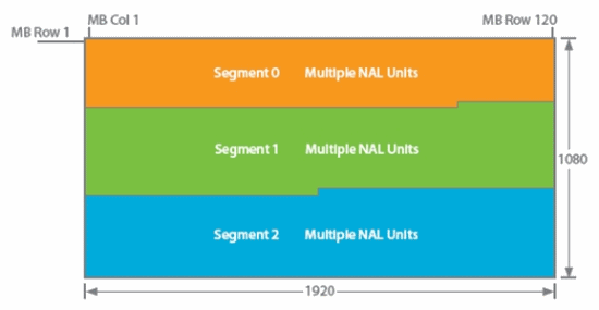 在這種架構中,編碼器的實施分配到多個 DSP 內核。每個宏塊條都分配到一個DSP內核。其中每個內核都提供一些特定功能,如:速率控制與幀內圖像處理。事實上,無法預先進行比特預算并分配到各個宏塊條,因為不同宏塊條可能具有不同的圖像復雜性,而在圖像分割塊之間采用差異很大的Qp值會造成合成圖像的層邊界出現偽影。在H.264中,宏塊條NAL可以包含任意數量的宏塊,因此與H.263不同,圖像分割塊的形狀無需符合GOB邊界。每個宏塊條的頭部(slice