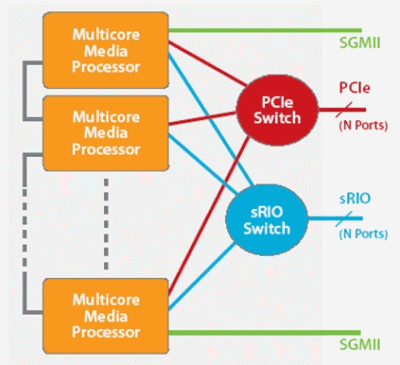 圖3說明,高速串行I/O在復雜視頻處理任務中的潛在應用。圖中顯示用于擴展多個器件中多核器件處理能力的連接方案,其可以實現更復雜的視頻處理運算或支持更多視頻轉碼通道。采用sRIO開關能夠實現更靈活的器件間通信,不過如果處理流處于相鄰器件之間,也可以不采用這種開關。與PCIe開關相比,sRIO由于其數據包開銷較低,因此一般成本更低、性能更高、且時延更短。