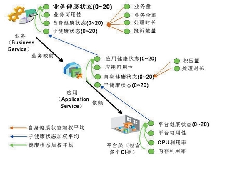CI/KPI模型的建立,成功地將傳統(tǒng)監(jiān)控系統(tǒng)的監(jiān)控難點(diǎn)轉(zhuǎn)變?yōu)榱咙c(diǎn),通過對(duì)模型中父子業(yè)務(wù)間關(guān)系、業(yè)務(wù)與后臺(tái)資源間關(guān)系的結(jié)構(gòu)化梳理,多維度數(shù)據(jù)的采集計(jì)算,有效量化了業(yè)務(wù)健康度指標(biāo)。同時(shí),模型中所綜合的業(yè)務(wù)可用性、業(yè)務(wù)辦理量、后臺(tái)資源使用情況等全方位信息,尤為適合公司管理人員了解業(yè)務(wù)通體運(yùn)營(yíng)情況。