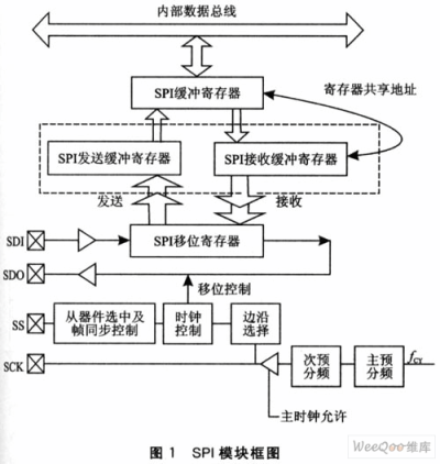 dsPIC30F6014提供了2個SPI接口模塊,每個接口模塊包括三個特殊功能寄存器和四個引腳。SPIxBUF是數(shù)據(jù)緩沖寄存器。需要注意的是,接收緩沖SPIxRBF和發(fā)送緩沖SPIxTBF共享同一個地址,即它們都是地址映射到SPIxBUF的。也就是說,當(dāng)對接收或發(fā)送緩沖寄存器操作時,都只能對SPIxBUF進行操作,而不能直接對SPIxRBF或SPIxTBF進行操作。SPIxCON是控制寄存器,用來對sPI模塊的操作模式等進行配置;SPIxSTAT是狀態(tài)寄存器,用來標(biāo)示SPI模塊所處的狀態(tài)。其模塊框圖如圖1所示。