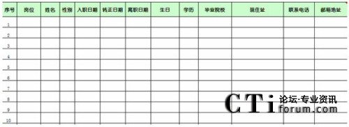 表格內(nèi)容包括:人員姓名、出生年月、入職時(shí)間、轉(zhuǎn)正時(shí)間、離職時(shí)間、調(diào)動(dòng)時(shí)間、學(xué)歷情況、畢業(yè)院校、家庭住址、聯(lián)系信息等。