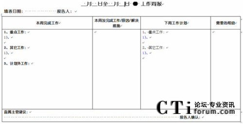 用于各級(jí)管理人員填寫匯報(bào)工作周總結(jié),同時(shí)也是與上一級(jí)的一種溝通渠道。