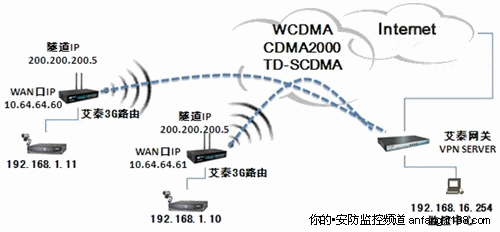 此組網(wǎng)方案是在艾泰3G路由器連接到公網(wǎng)監(jiān)控中心的基礎(chǔ)上建立VPN隧道方式來傳輸視頻圖像,組網(wǎng)實(shí)施如下: