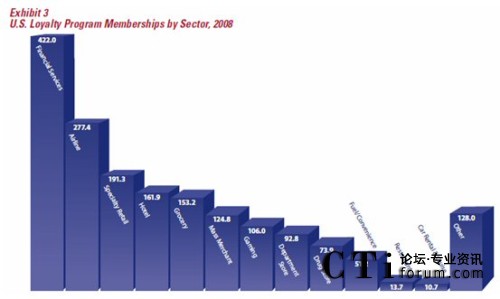 在美國(guó),忠誠度營(yíng)銷應(yīng)該用為廣泛的五個(gè)行業(yè)/領(lǐng)域是金融服務(wù)(銀行、保險(xiǎn)、證券、基金等)、航空、專門零售(例如各類的專賣店、品牌連鎖)、酒店及百貨。值得一提的是,近兩年來,金融服務(wù)行業(yè)在忠誠度營(yíng)銷的應(yīng)用發(fā)展迅速,各類忠誠度計(jì)劃的參與人數(shù)由2006年的2.388億上升到2008年的4.22億,這個(gè)增長(zhǎng)主要是由各類具備信用卡、借記卡功能的聯(lián)名卡發(fā)行所致。