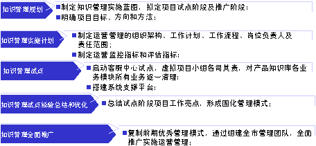 萬丈高樓平地起,本項目由客服中心總經(jīng)理牽頭,副總經(jīng)理和部門經(jīng)理組成領(lǐng)導(dǎo)小組,全面審視中心運營管理現(xiàn)狀,探索“SECI知識循環(huán)管理”理論與實際工作結(jié)合點,針對客服中心滿意度提升的三大主要癥結(jié)勾勒出知識管理實施藍圖,試點階段和推廣階段,總體目標(biāo)和階段性目標(biāo),監(jiān)控手段和評估指標(biāo)等。