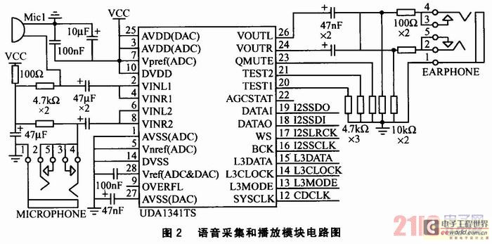 語音采集和播放模塊的作用是將音頻模擬信號轉(zhuǎn)換為數(shù)字信號,并對信號進(jìn)行PCM編碼。其電路如圖2所示。采用Philips公司的UDA1341 TS型立體聲音頻CODEC進(jìn)行音頻編解碼。該芯片提供2個麥克風(fēng)輸入,可實(shí)現(xiàn)單端輸入、差分輸入等靈活配置,并設(shè)置了可編程增益放大器和自動增益控制器,可保證高質(zhì)量的音頻獲。煌瑫r,還集成了聽筒和喇叭輸出的驅(qū)動器,喇叭音量可以通過編程調(diào)整。S3C2440A-40微處理器與UDA1341TS編解碼器通過I2S總線直接相連,并采用DMA發(fā)送/接收方式,完成系統(tǒng)的錄音和放音。