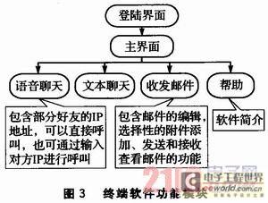 用戶打開終端軟件,可以根據(jù)自己的需要選擇語音聊天、文本聊天或者收發(fā)郵件。進(jìn)行語音聊天前,用戶可以直接在好友欄中選擇聊天對象,也可直接輸入對方的IP進(jìn)行連接。語音聊天的過程是:說話方,麥克風(fēng)采集模擬語音信號→語音芯片采集量化編碼→嵌入式系統(tǒng)對信號進(jìn)行壓縮編碼→RTP格式打包→UDP格式打包→IP格式打包→Internet網(wǎng)絡(luò)傳輸;收聽方,接收語音數(shù)據(jù)→去IP/UDP/RTP包頭→嵌入式系統(tǒng)對信號解碼→語音芯片將數(shù)字語音信號轉(zhuǎn)為模擬信號→揚(yáng)聲器播放。