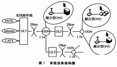 系統(tǒng)的總體結(jié)構(gòu)如圖1所示。它與傳統(tǒng)的EPON系統(tǒng)的主要區(qū)別在于本系統(tǒng)在普通ONU中融合了Wi—Fi無(wú)線組網(wǎng)方式,同時(shí)為終端用戶提供有線和無(wú)線兩種方式的服務(wù)。這里將本系統(tǒng)命名為融合型ONU。