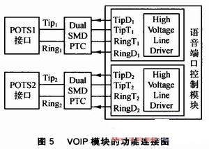 VOIP模塊的功能連接圖如圖5所示。Dual SMD PTC叫做雙重?zé)崦綦娮,可?duì)過(guò)熱和過(guò)流雙重作用導(dǎo)致的電路故障進(jìn)行保護(hù);Tip and Ring(正極線和負(fù)極線)表示組成電話配線電路的兩條電線,Tip是正極線的別稱,Ring是負(fù)極電線的別稱。
