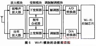 Wi—Fi模塊的功能連接圖如圖6所示。本系統(tǒng)的天線是外置天線,這樣能盡量穩(wěn)定信號(hào)。天線與RF射頻模塊相連,RF射頻模塊大致可分為放大模塊、變頻模塊、調(diào)制解調(diào)模塊等有源部件,然后通過(guò)A/D、D/A轉(zhuǎn)換與Wi—Fi控制芯片相連。Wi—Fi控制芯片控制整個(gè)無(wú)線模塊的運(yùn)行。