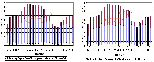 合理調(diào)配資源是指應(yīng)用智能管道技術(shù),并結(jié)合激勵(lì)型市場(chǎng)定價(jià),運(yùn)營商能夠減少網(wǎng)絡(luò)空載時(shí)間或降低低載率,在網(wǎng)絡(luò)忙時(shí)留出更多的資源給高付費(fèi)用戶和業(yè)務(wù),從而在相同的資源下獲得更高的收益。下圖是某運(yùn)營商引入智能管道前后的數(shù)據(jù)分布效果圖,忙時(shí)高付費(fèi)業(yè)務(wù)增加,非忙時(shí)總業(yè)務(wù)量增加(主要來自于低付費(fèi)業(yè)務(wù)),這些都為運(yùn)營商帶來了額外的收入。實(shí)際增收效果會(huì)因智能管道策略的力度和動(dòng)態(tài)調(diào)整的效果而有不同,通常都會(huì)增加幾個(gè)百分點(diǎn)甚至更高。