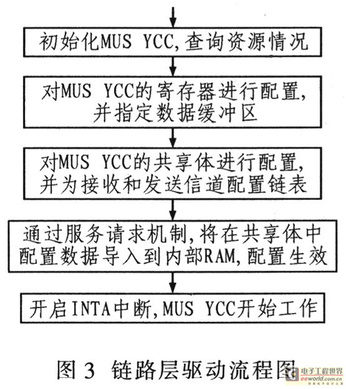 鏈路層HDLC控制器主要完成內部寄存器和映射的共享體配置。共享體用于HDLC寄存器的初配、接收和發(fā)送緩沖區(qū)以及時隙映射表的配置。HDLC控制器為每個信道都建立一個消息鏈表,這樣數(shù)據(jù)緩沖區(qū)可以循環(huán)利用。HDLC控制器與成幀器的對應關系決定于HDLC控制器端口映射方式的設置。其配置流程如圖3所示。