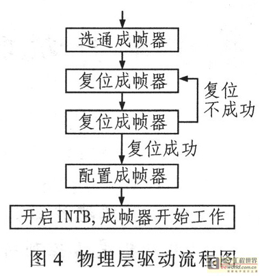 物理層通過地址總線映射配置成幀器,其中PCI橋設備和成幀器之間經過CPLD控制選通。物理層驅動完成配置成幀器、復位控制等。成幀器是將E1上的比特流整合成符合規(guī)范的HDLC幀,其中一個標準HDLC幀包括32個時隙,這些時隙可配置映射到HDLC控制器的端口信道,實現(xiàn)2 M、N×64 K、N×8 K高速模式。其配置流程如圖4所示。