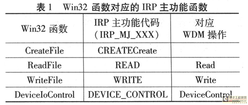 在Windows中,應用程序與WDM通信的實現(xiàn)過程:應用程序應先獲得設備句柄GUID碼,然后利用CreateFile函數(shù)打開設備,通過 DeviceIoControl函數(shù)傳遞控制代碼參數(shù)和WDM進行通信,包括從WDM中讀取數(shù)據(jù)和寫數(shù)據(jù)給WDM兩種情況,也可利用ReadFile從 WDM中讀取數(shù)據(jù)或用WriteFile寫數(shù)據(jù)給WDM:當下層驅動有觸發(fā)事件時,就需要Event事件通知上層軟件。當應用程序退出時,CloseHandle則關閉設備,這將產生對應于此設備對象的相應IRP消息。這種關系如表1所列。