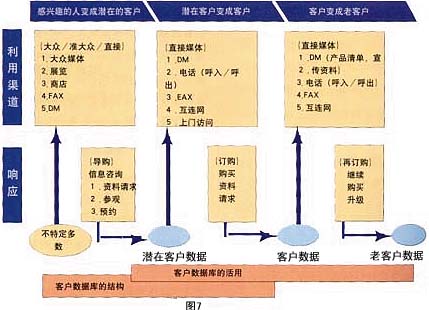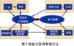 ——銷售支持:東京煤氣公司擁有三種主要的家用產(chǎn)品:地板式空調(diào),煤氣暖氣及煤氣衣服干燥機(jī)。此公司于1993年開始運(yùn)用數(shù)據(jù)庫營(yíng)銷,現(xiàn)已取得了驕人的成果。其中主力產(chǎn)品——地板式空調(diào),盡管周期長(zhǎng)、價(jià)格高,1997年一年就銷售了3萬6千套,同時(shí)從對(duì)這些用戶調(diào)查的結(jié)果發(fā)現(xiàn)“滿意”的占96%。下面介紹一下“地板式空調(diào)”的營(yíng)銷方法(見圖5)