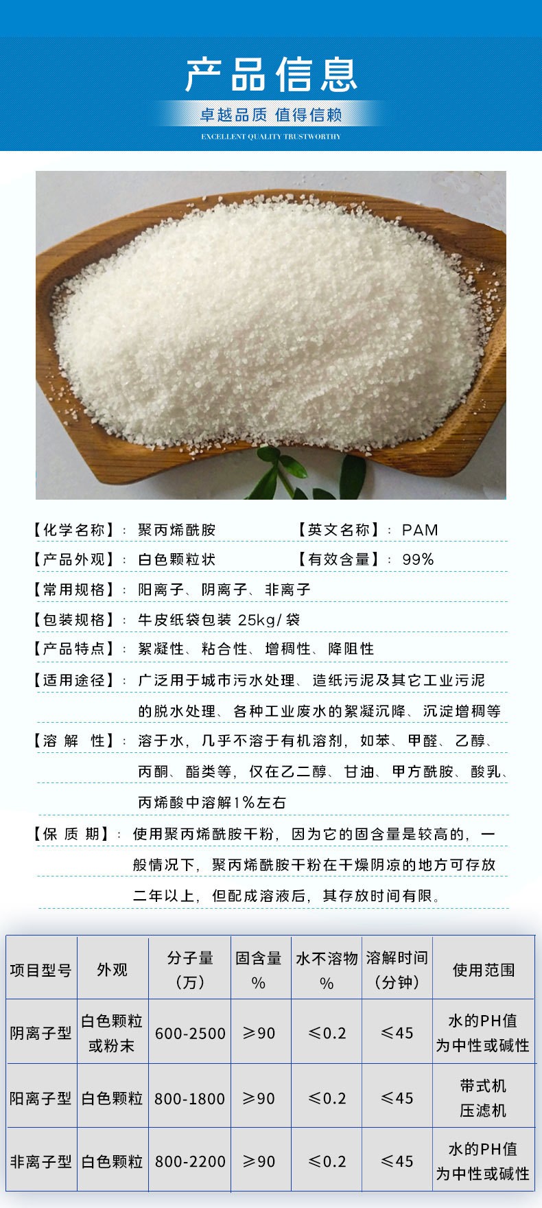 聚丙烯酰胺的選型主要還是根據(jù)污水水質(zhì)所帶的電荷類型不同來定,根據(jù)水質(zhì)的特點來選擇采用陽離子聚丙烯酰胺、陰離子聚丙烯酰胺、非離子聚丙烯酰胺等,不管什么行業(yè)的什么水質(zhì),選對型號是很關(guān)鍵的。