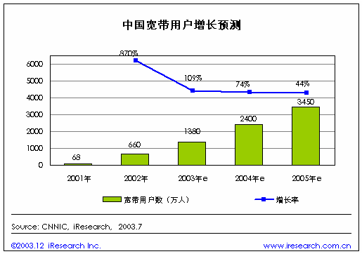 進(jìn)入2003年下半年,幾乎所有人都可以明確地感受到中國寬帶市場的不斷升溫。中國電信、中國網(wǎng)通這兩大運(yùn)營商以爭奪寬帶用戶、擴(kuò)大市場占有率為目標(biāo)的價(jià)格戰(zhàn)全面打響,并且日趨白熱化。寬帶接入的價(jià)格門檻以令人難以置信的速度不斷下調(diào)。與此同時(shí),寬帶用戶的數(shù)量則呈現(xiàn)雪崩式激增,一條以寬帶運(yùn)營商為龍頭,涵蓋軟件提供商、互聯(lián)網(wǎng)內(nèi)容服務(wù)商、計(jì)算機(jī)生產(chǎn)商、設(shè)備制造商等在內(nèi)的寬帶產(chǎn)業(yè)鏈正在迅速形成,并且不斷壯大。中國的寬帶市場進(jìn)入前所未有的繁榮期。