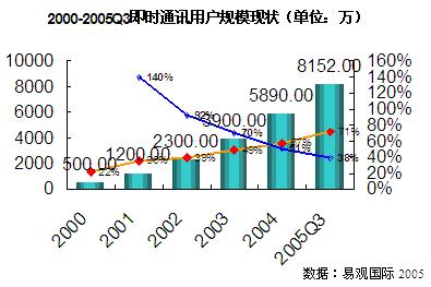 從1999年騰訊推出 OICQ 開始,短短幾年時(shí)間中,即時(shí)通信用戶數(shù)量迅速增長(zhǎng)。在2000年至2004年期間,年增長(zhǎng)率分別為140%、92%、70%和51%。根據(jù)易觀國(guó)際大樣本調(diào)研的結(jié)果,到2005第三季度中國(guó)即時(shí)通訊用戶數(shù)量增長(zhǎng)到8,152萬,比去年增長(zhǎng)38%。